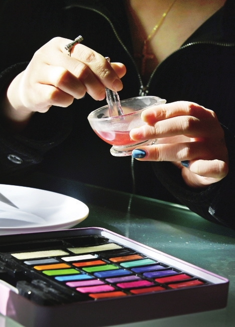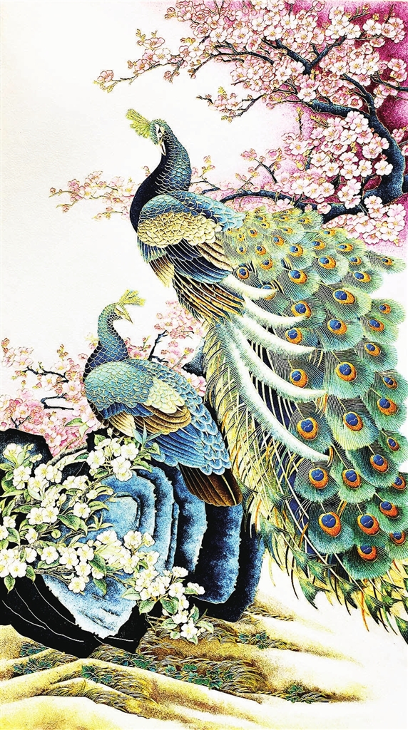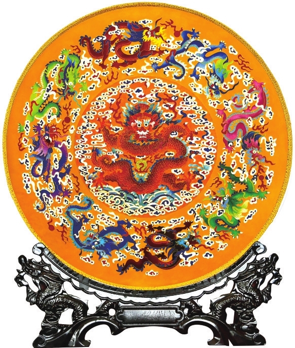 一张圆圆的木台,一块方方的亚克力板,几盏光滑的瓷盘上,荷花绽放,龙飞凤翥,孔雀展屏,牡丹吐艳,江山无限……金丝珐琅画,在这些“胎体”上,“绘”出了斑斓多彩的世界。