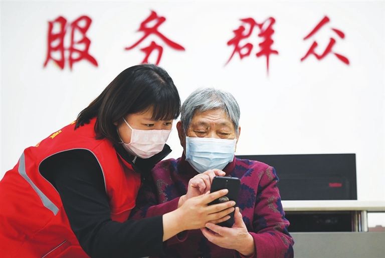 万柏林区地矿社区针对社区部分老年人不会使用智能手机遇到“出行难”问题,网格员开展一对一讲解。图为3月10日,网格员赵静芳正在为82岁的康奶奶演示行程卡和健康码的出示方法。 邓寅明 摄