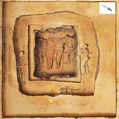 M32有一椁一棺,该墓下葬后遭到毁坏,墓主人被从棺内拖出,头骨及上肢骨遭扰乱、火烧。墓主人发现时位于棺盖板上方,身下留有大面积朱砂痕迹。墓室内发现6具殉人。共出土铜、陶、骨、贝、蚌等共计51件(组),其中海贝(贝币)39件,毛蚶壳、骨环各3件,青铜短剑、绿松石管、蚌饰、陶罐、陶盆、陶三足瓮残片各1件。M21一棺,棺内有人骨1具,随葬品仅陶盆1件。