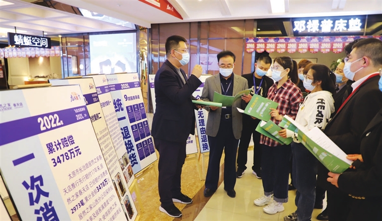3月15日上午,小店区市场监督局、区消协开展“3·15”国际消费者权益日宣传活动。工作人员兵分多路进市场、进超市,向市民分发宣传材料、讲解维权知识。图为工作人员在居然之家春天店宣讲。 张昊宇 摄