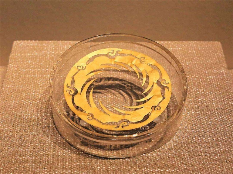 太阳神鸟金饰内层图案是向四周喷射出十二道光芒的太阳,动感十足,外层四只展翅的神鸟围绕着太阳循环往复地飞翔。这件文物构图严谨、线条流畅、极富韵律,充满强烈的动感,与中国古代的“金乌负日”传说不谋而合,不仅体现了中国人对于光明的热爱,也彰显自由、美好、团结向上的寓意。