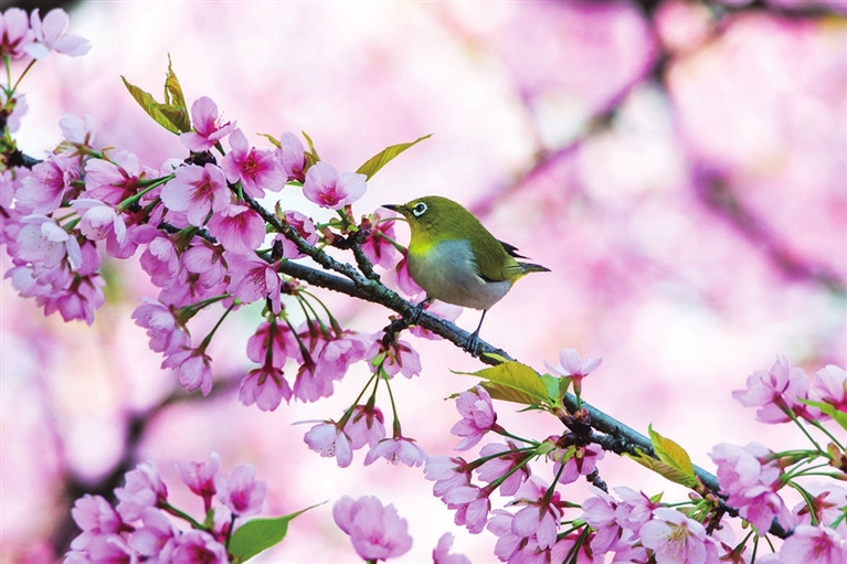 3月16日,一只绣眼鸟在江苏无锡太湖鼋头渚景区的樱花枝头上小憩。