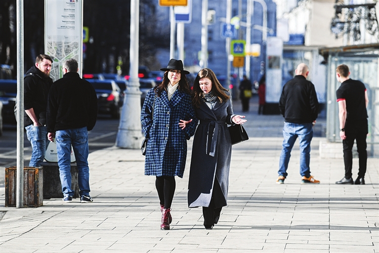 3月15日,行人走在俄罗斯首都莫斯科街头。莫斯科市长索比亚宁14日宣布,该市自15日起取消公共场所强制戴口罩规定。 新华社 发