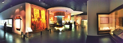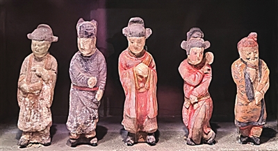 宋金时期,杂剧开始在山西南部的市肆和乡村兴起。到元代,角色搭配、服装道具等更加丰富多彩。第三单元展示的金代砖雕墓室,再现了金代杂剧演出的真实场景。出土于山西省侯马市董明墓的金代戏台最为精巧。另一座侯马出土的金代晚期砖雕墓,同样佐证着中国古代戏曲文化的繁荣。展厅中各式各样的戏台微缩模型和精美的戏曲壁画,同样弥散着“戏曲故乡”文化繁荣的气息。