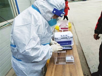 当日上午8时许,海东社区工作人员和棉花巷卫生服务站的医护人员,早早来到大剪子巷,做好核酸检测的准备工作。试管、箱子、棉签、核对名单……大家分工明确,反复核对,每个环节都严谨细致。这些用于核酸检测的物品当中,有一个透明盒子十分抢眼。这个盒子有牛奶箱大小,分上下两层。前来做核酸检测的快递从业者,看到这个塑料盒子都很好奇,不知道它的用途。等医护人员扫描他们的身份证时才发现,为避免接触,医护人员将手机放在塑料盒上方,他们的身份证放在塑料盒下方,医护人员不用拿起手机,也不用拿身份证,就可扫描身份证。