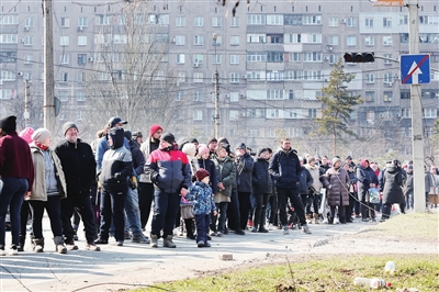 3月23日,当地居民在马里乌波尔排队领取人道主义物资。 新华社 发