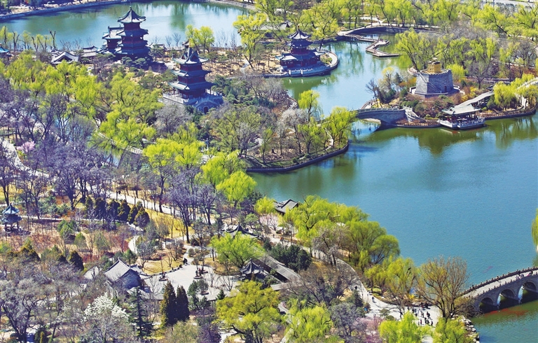 3月27日,鸟瞰迎泽公园,满眼的嫩绿引得游人走出家门享受春的魅力。张昊宇 摄