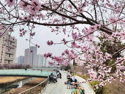 “啥时候建起了这么多小游园!”这一路,他们发现了更多“新大陆”。南沙河沿岸的小游园里,灌木丛已冒出新绿,桃花、杏花、迎春花尽情绽放。被风吹动的花朵旋转飘下,李晓燕不由得蹲身捡起。远远望去,南沙河两岸已笼在嫩绿中,粉色、白色的花朵掩映,平添一份浪漫。