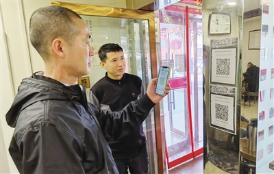 3月27日,鼓楼街一餐厅门口,顾客正积极配合防疫要求扫描山西场所码。山西场所码是通过“地址码+健康码”的方式,核验居民健康状况、有效记录行动轨迹,筑牢防疫“围栏”。 徐浩轩 王韵菲 摄