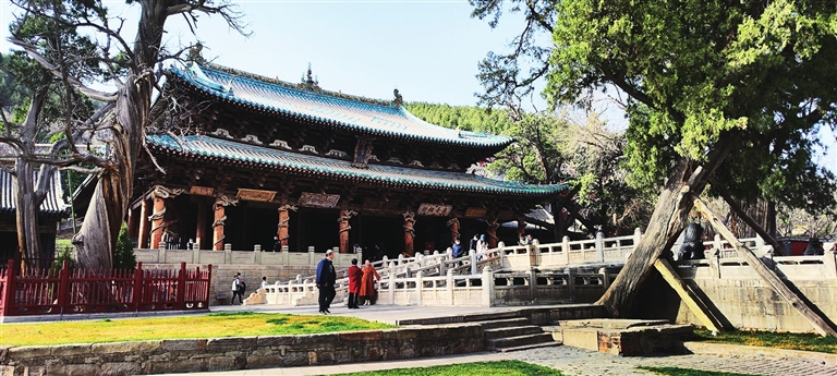 穿过对越坊,便是晋祠的三大著名建筑——献殿、鱼沼飞梁和圣母殿。献殿始建于金大定八年(1168),是我国目前仅存的金代木结构祭祀性建筑。献殿与圣母殿间是一座十字形板桥——鱼沼飞梁。梁思成曾赞:“此式石筑桥,古画中偶见,实物仅此一例,洵为可贵。”鱼沼飞梁相连的是圣母殿,始建于北宋天圣年间。宋徽宗崇宁年间重修并扩建,现存是当年重修之物。圣母殿梁架建造技法,是我国现存古建中唯一符合《营造法式》殿堂式构架的实例。