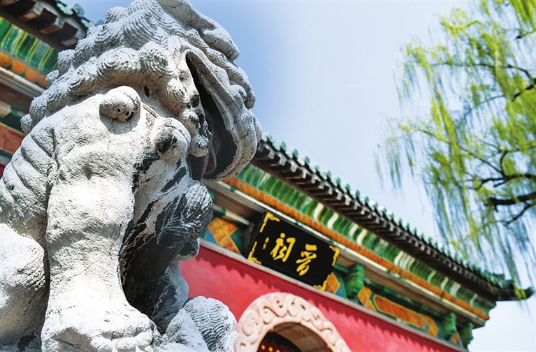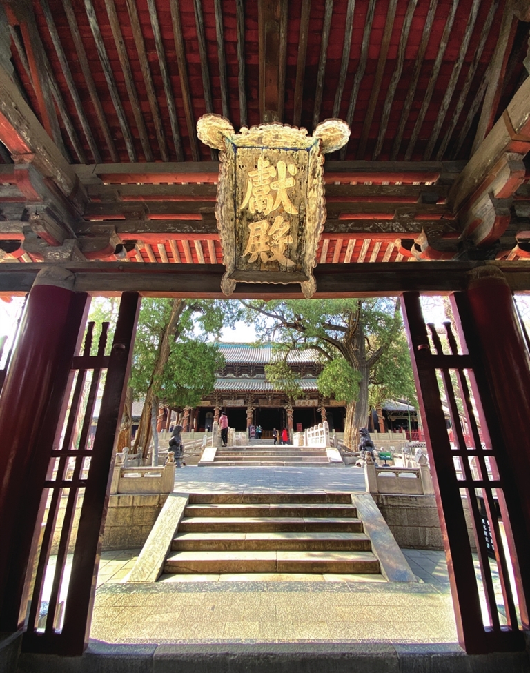 穿过朱红色山门,晋祠建筑之美直面而来:大殿楼阁在古树婆娑、溪池映带之间,散发着千年岁月沉淀的威严气度;亭台水榭在林翳掩映、檐角交错之中,弥漫着花静鸟喧的天然意趣。