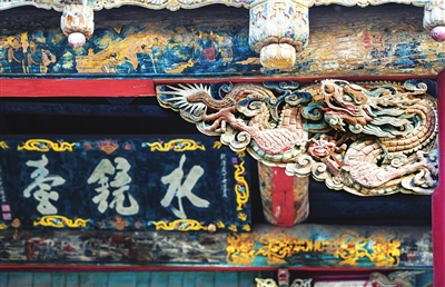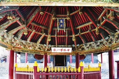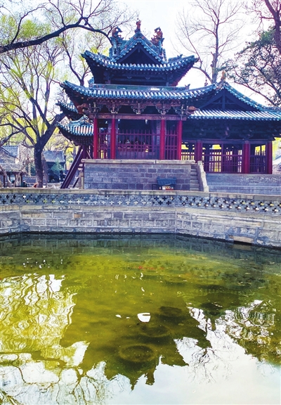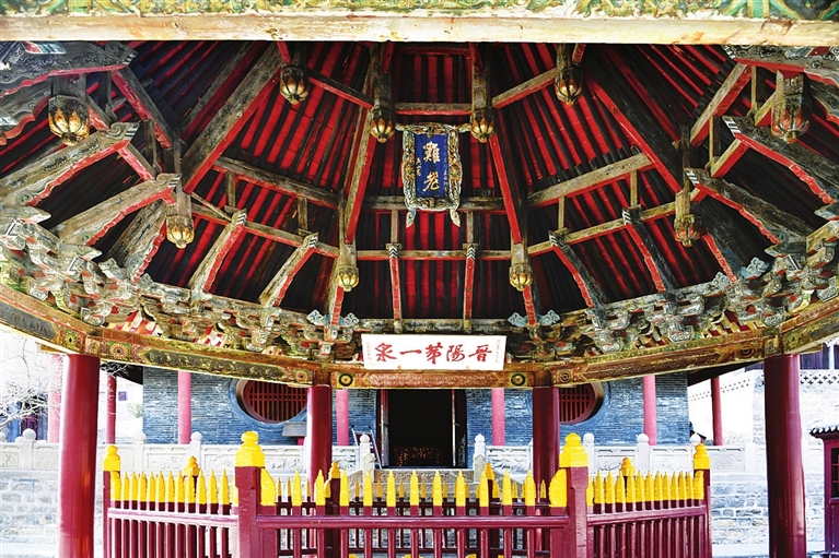 沿中轴线向西,第一座建筑是水镜台。这座始建于明代的戏台,融合了殿、台、楼、阁建筑风格。水镜台西,有一条智伯渠,会仙桥将两端通联。前方的金人台上,红、绿、黄三彩的明代琉璃阁,很是抢眼。台四周四铁人高举着臂膀,撑架着威严。建于明万历四年(1576)的对越坊在金人台西,牌坊顶以琉璃瓦覆盖,造型玲珑剔透,疏朗大气。