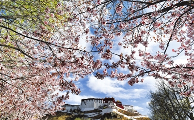 今年3月,拉萨气温较往年偏高,花季提前,布达拉宫周围鲜花盛开。新华社 发