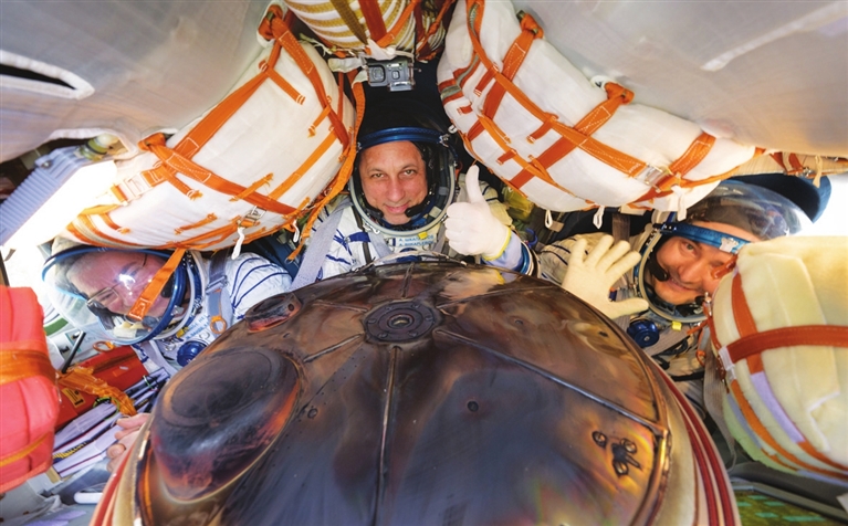 3月30日,美国宇航员马克·范德·海(左)与俄罗斯宇航员彼得·杜布罗夫(右)和安东·什卡普列罗夫在“联盟”飞船上。 新华社 发