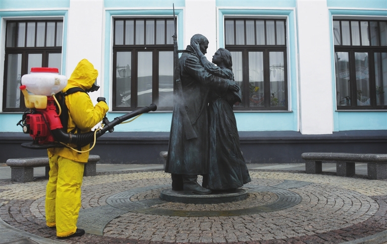 3月30日,身穿防护服的工作人员在俄罗斯莫斯科的白俄罗斯车站喷洒消毒液。