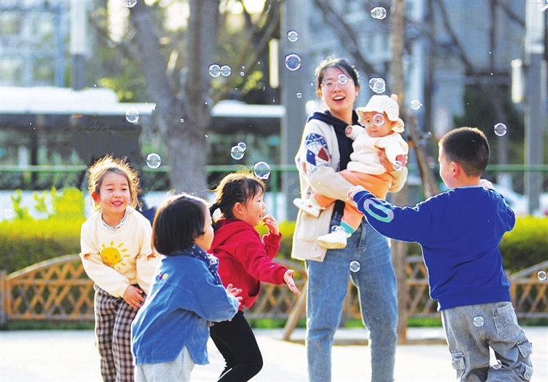 随着气温回升,众多市民来到公园踏春游玩,乐享春光。图为4月3日,西海子公园中,小朋友们正在欢快地玩耍。 徐浩轩 王韵菲 摄