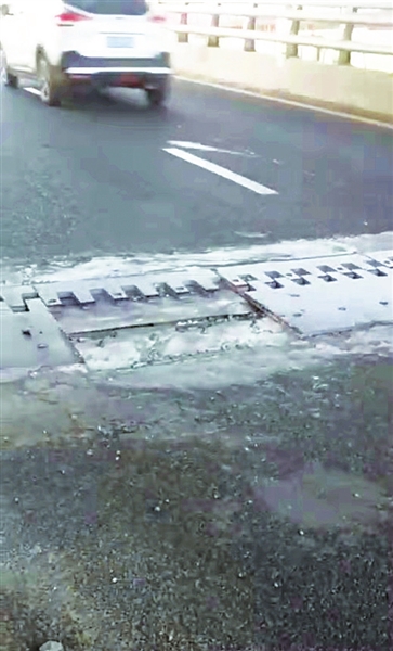 市民李先生反映,4月1日下午5时许,他驾车经滨河东路(南向)进入摄乐桥东(北)匝道,准备驶上大桥。在匝道行驶时,他的车突然剧烈抖动一下,随即发现方向盘沉重。李先生立即停车查看,发现左前轮胎爆胎。进而他发现了爆胎原因,桥墩与桥墩连接处的伸缩缝,原本有齿状钢板连接覆盖,但这里的一块钢板出现了松动和位移,致使原本平整的匝道出现了坑槽,李先生的车轮就是通过坑槽时发生的爆胎。李先生介绍,由于缺少警示标志,不少车经过时都出现了颠簸甚至爆胎,所幸匝道上车速不快,未发生事故。
