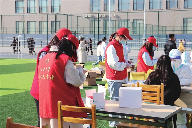 3日上午,面对突如其来的疫情,山西大学迅速启动应急处置预案,三校区实行封闭管理。位于管控区的东山和坞城两校区,第一时间组织全员核酸检测,先学生、后老师,分组、分时段错峰检测。师生们佩戴口罩、一米线外有序排队,志愿者们登记信息、引导秩序,核酸检测工作有条不紊。截至4月3日23时,全校共检测21811人。志愿者们分工明确、各司其职,默默奉献,他们的身影活跃在校园的各个角落,为校园防疫工作提供了有力保障。