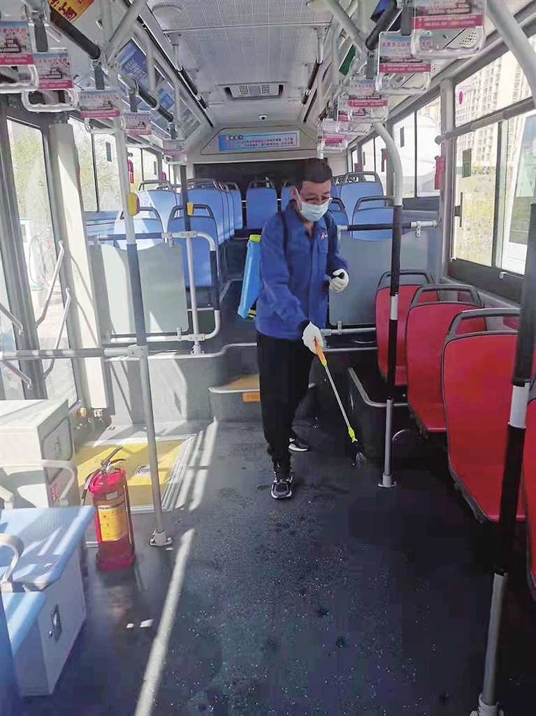多年前,温科做过腰椎手术,造成右腿萎缩。最近一段时间,高强度的工作让他走起路来一瘸一拐,但不管多累,温科都会一丝不苟地高质量完成消杀。同事劝他休息,他总是笑着摇摇头,手里的工作却始终没有停下。“没事儿,我不累,车辆及时消了毒,乘客坐车才安心,我心里才踏实”。