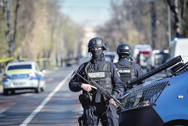 4月6日,警察在罗马尼亚布加勒斯特的俄罗斯驻罗大使馆附近警戒。 新华社 发