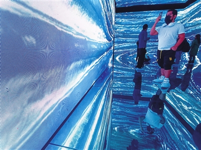4月4日,参观者在墨西哥首都墨西哥城的未来博物馆参观多媒体声光秀。 新华社 发