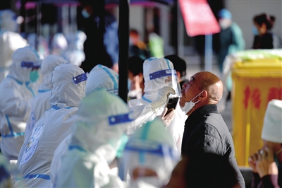 4月9日,医护人员正在为小店街道永康北路社区的居民做核酸采样。当日,小店区进行第三轮全员核酸检测。 记 者 韩双喜 摄