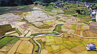 春耕时节,在广西大化瑶族自治县大化镇龙口村富硒水稻种植基地,稻田和村舍构成美丽的乡村风景线。 新华社 发
