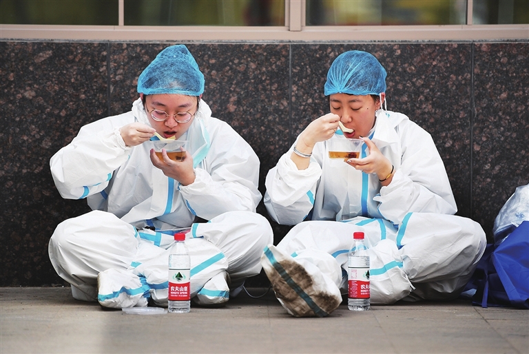 4月10日,万柏林区和平路上,抗疫志愿者张静瑶和葛铭淇在连续工作8个多小时后,坐在墙角吃着盒饭。在万柏林区首轮全员核酸采样过程中,志愿者们默默付出,守护疫情防控“安全门”。 记者 邓寅明 摄