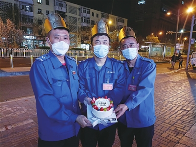 10日晚上10时许,在应急保障休息点,一场特殊的生日会悄然开始了。“目前处于特殊时期,我们没有办法准备鲜花和礼物,只能利用休息间隙,送上一块小小的蛋糕和一份真挚的祝福。祝你们生日快乐!”李刚说。
