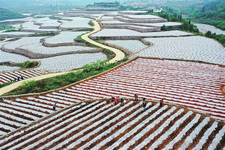 4月10日,在贵州省黔南布依族苗族自治州福泉市陆坪镇罗坳村,村民在田间劳作(无人机照片)。