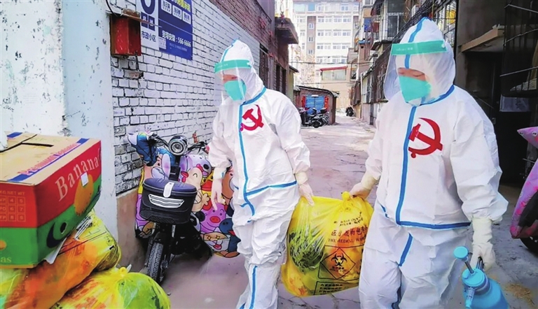 水产宿舍小区在封控区,居民们对党员志愿者的工作赞许满满。一位居民说:“他们每天给我们送水、送菜、送药,胸前都贴着大大的党徽。他们每天还在院里和楼道里消毒,我们虽然被隔离,但是随时能看到他们,就觉得挺放心,很安全。”