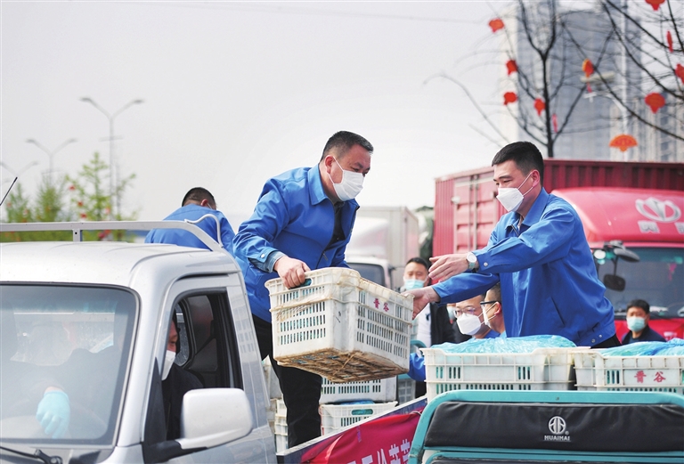卸车、称重、转运……在河西农副产品市场交易区,市场工作人员详细记录着送来的菜品、重量、金额。负责转运的三轮车有序排队等候。