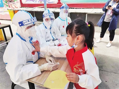 “叔叔阿姨你们辛苦了,加油!”4月11日上午,宁化府社区全员核酸检测结束后,7岁的赵跃舒小朋友,为“大白”们贴上“小红心”,表达自己的敬意。