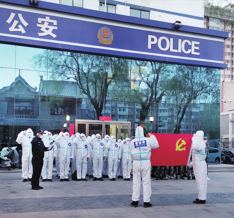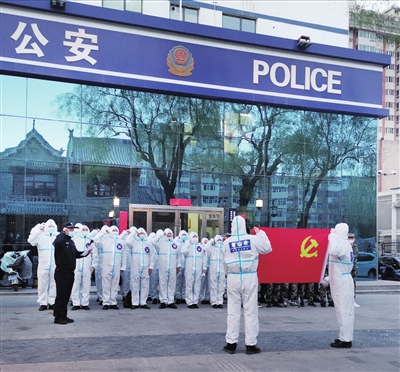 连日来,公安杏花岭分局各派出所通过出征誓师、重温入党誓词等形式,强化党员民警、辅警做好疫情防控的使命担当,护航全区全员核酸检测工作。图为4月13日凌晨5时40分,坝陵桥派出所举行誓师大会,民警、辅警随后走上工作岗位。 刘友旺 赵冠芳 摄