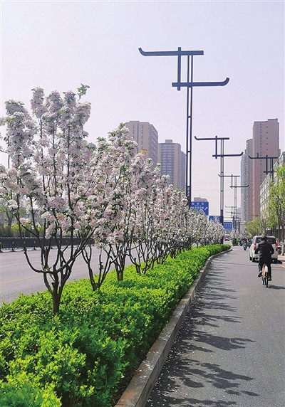 刚走出巷口,刘玉清就被眼前的美景所吸引,机动车道和非机动车道之间绿化带内的海棠花开得正旺,一簇簇白花还夹杂着些许粉色,让人感觉心旷神怡。靠近绿化带的路面基本被掉落的花瓣覆盖,别是一番美景。刘玉清沿着解放路一边走一边赏花,沉浸在了美丽的春景中。