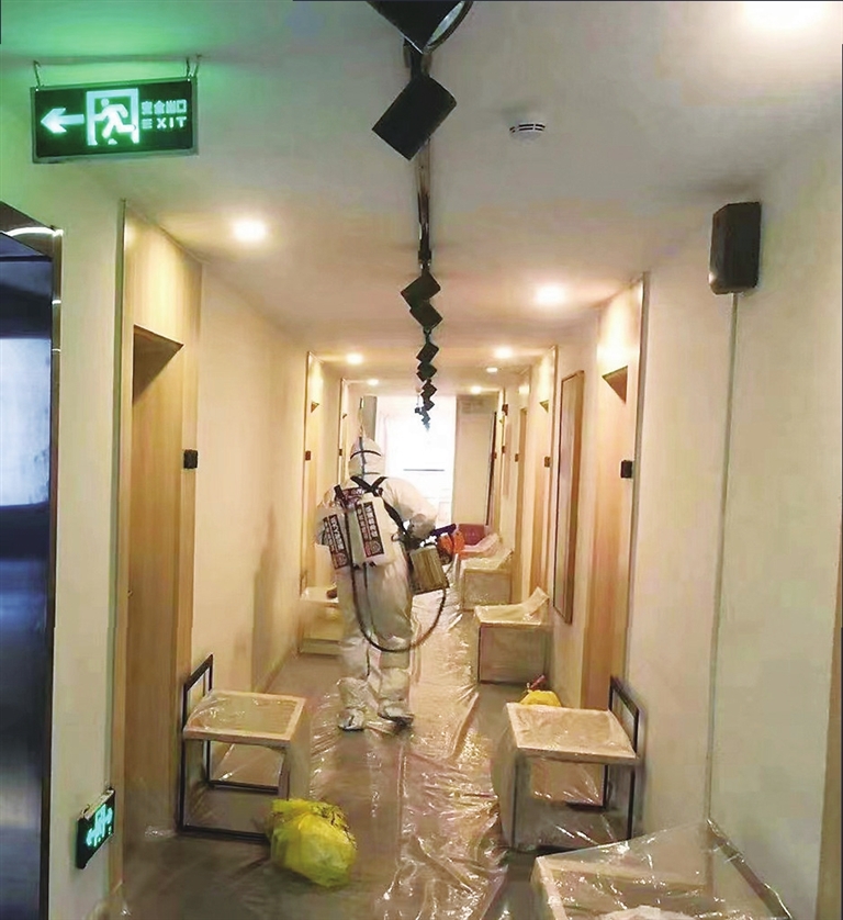 除固定消杀之外,只要有新隔离人员进入,他们就要对此人在集中隔离场所的行动轨迹进行消杀,若有隔离人员离开,他们同样对相应腾空的房间进行消杀。4月17日,50多人完成隔离,綦鸿博和任杰对这些房间进行了彻底消杀,耗时费力,几乎精疲力竭。“只有真正穿过全套防护服的人,才能体会到那种密不透风的闷热,更何况还背上20多公斤重的弥雾机和药水,来回穿梭。”