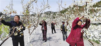 “我们的果园总占地面积900多亩,其中玉露香梨450亩,樱桃60多亩,其他的就是红杏、李子、核桃,目前,梨花都已经盛开,现在主要的任务就是给梨树疏花,时间也就一周左右,10天后就要开始疏果,这样才能保证果品的甜度和质量,时间很紧,任务很重。”风峪新村锦绣合作社负责人郭引贵说:“因为有了街办的配合,目前,我们已经完成三分之一的作业,剩下的正在紧张有序进行中……”