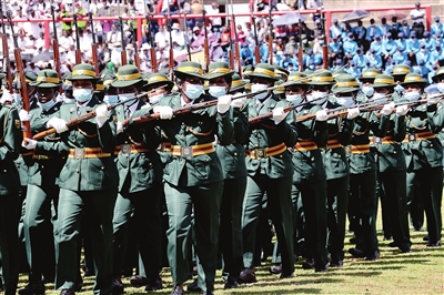 4月18日,在津巴布韦第二大城市布拉瓦约,津国防军在独立42周年庆典阅兵式上表演。