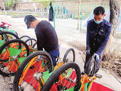 4月20日上午,长风公交停车场,这里是太原公共自行车公司二车队的集中保养点,大量公共自行车被整齐地倒置在地面上,几名维修工人正在有序分工合作。4月20日起,全市4.1万辆公共自行车开始春季大保养。 袁剑锋 陈志敏 摄