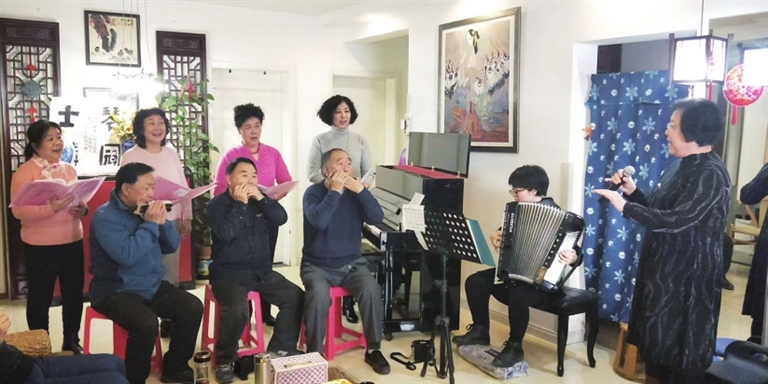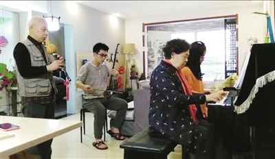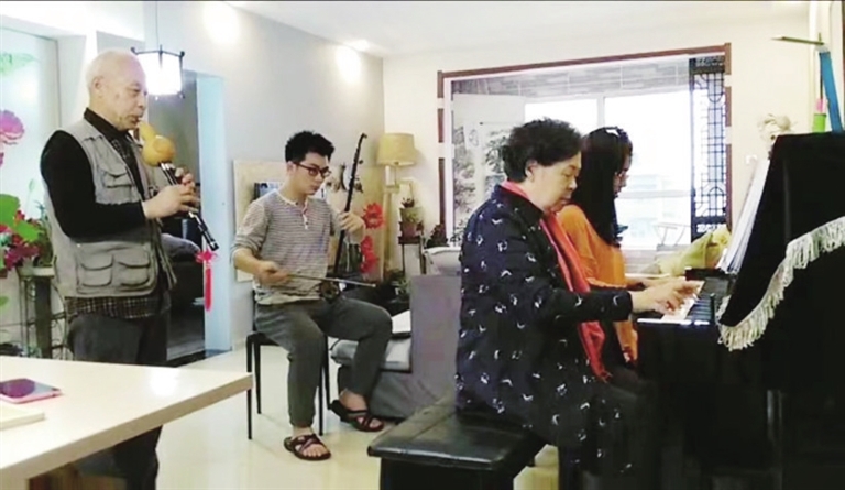 经过多次敲定节目后,我们就积极行动起来,一边准备,一边发电子邀请函给大家。几个互不相识的老同学和合唱团朋友、琴友演奏演唱的“桃花红杏花白”,是一个难度最大的节目。我把谱子发给他们,大家先分头排练,再集中到我家合排。老同学、小校友、插队小伙伴三个人的二胡、口琴,外孙女的手风琴,好朋友的独唱,四个琴友的伴唱,合作演出的效果真是棒极了!我们五个无伴奏重唱《弯弯的月亮》《雪绒花》,表演得也不逊色。