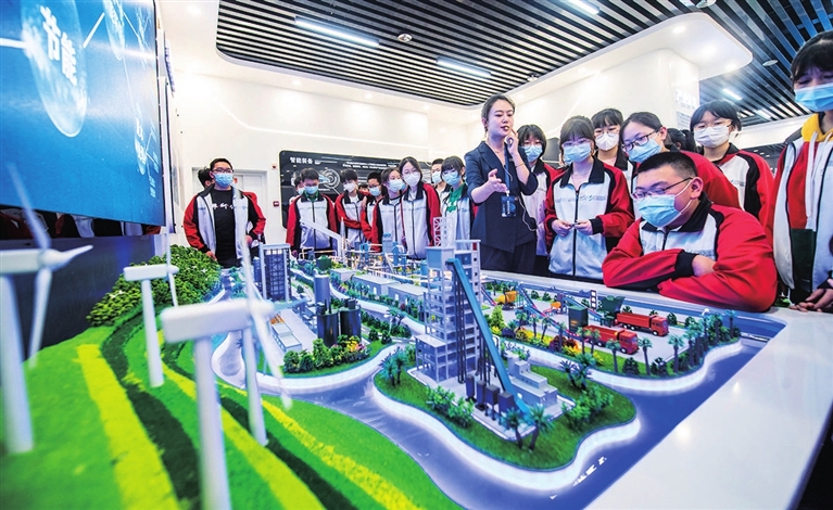 4月24日,在航天科技集团六院航天液体动力展示中心,讲解员宋柱英(中)为前来参观的西安市航天中学学生讲解。