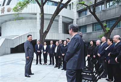 4月25日上午,中共中央总书记、国家主席、中央军委主席习近平来到中国人民大学考察调研。这是习近平在博物馆门前广场上,同老教授、老专家和中青年骨干教师代表亲切交谈。 新华社 发