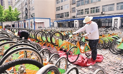 4月26日,太原公共自行车公司一车队加大公交自行车养护力度,并对车辆、锁桩进行全面清洁消毒,保障市民用车安全。 米国伟 辛世雄 摄