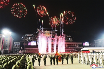 在随后举行的阅兵式上,包括战术导弹部队、坦克部队和防空火炮部队等各军兵种的方阵高呼口号,迈着整齐的步伐列队走过广场,接受金正恩等朝鲜领导人的检阅。阅兵式结束前,一批无人机腾空而起,在广场上空施放的焰火照亮了夜空。