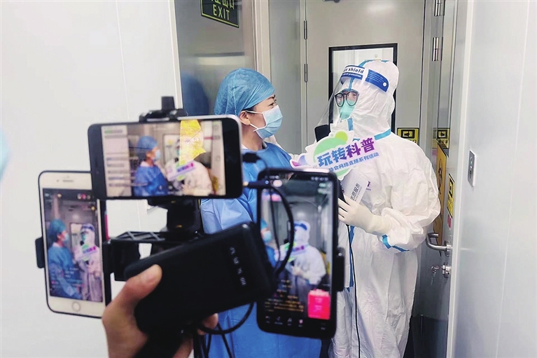一个小时的直播干货满满,两位医护人员手把手地讲解如何正确佩戴口罩、如何做好手部消毒、如何正确穿脱防护服等,该院门诊部的主任王媛还详细讲解了公众核酸检测流程、疫苗接种要点等。经过医护人员的指导,主播现场穿上防护服,变身“大白”走进了移动PCR方舱实验室,深入了解实验室的工作环境及流程。