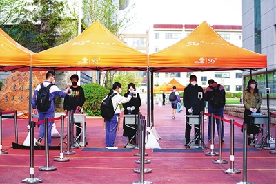 5月5日,东北师范大学附属中学高三年级的学生测量体温后进入校园。