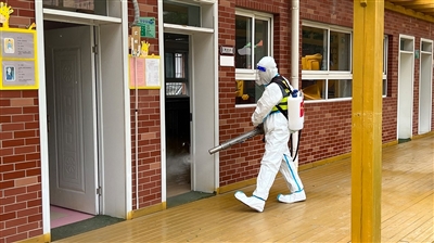 5月7日上午,该队派出队员7人,对起凤街小学的所有教室、办公室、操场等开展无死角消杀。面对校方的感谢,该队队长说:“能为孩子们的健康返校作出贡献,大家都感到特别高兴!”