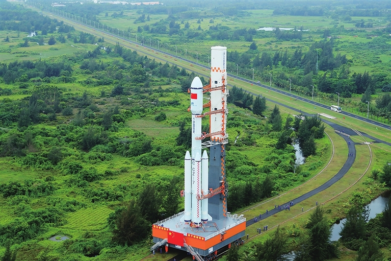 5月7日,天舟四号货运飞船与长征七号遥五运载火箭组合体在垂直转运。新华社 发