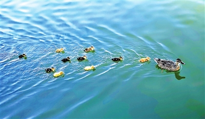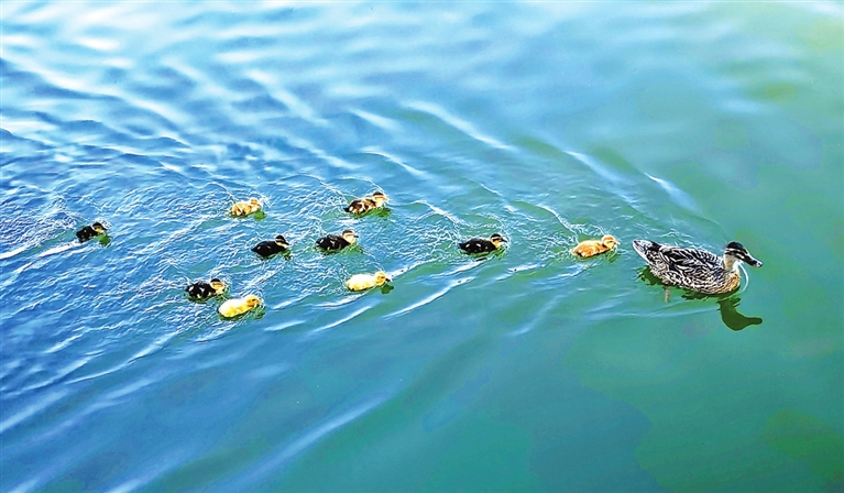拍摄时间:2022年5月 拍摄地点:山西太原 迎泽公园是太原最负盛名的公园之一,前几年改建后更是美不胜收。“五一”这天的早晨,我来到迎泽公园,看到彩色的鱼儿在清澈的水中畅游嬉戏,还看到各种鸟儿在林间飞舞穿行。感慨间,一只野鸭带着它新出生不久的十只小野鸭在水面鱼贯而来。多种动植物与人类和谐共享同一个美好空间,让人心生感动。 赵斗钢 摄