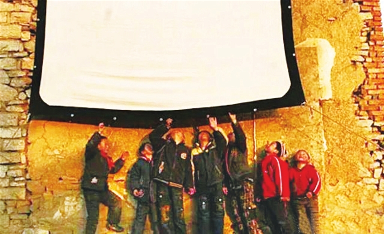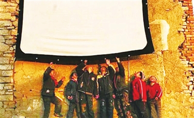 半下午的时候,放映员的身影还没出现,大队部里就挤满了人。等放映员骑着绿色“二八”自行车出现在乡亲们面前的时候,大家蜂拥而上,有的接车子,有的卸影幕,有的抬机器……不知谁家的孩子,早脱了鞋,光着脚,争相站在树下,嘴里衔着绳子,“噌噌”爬到树上,把影幕扯挂在两棵大树之间。洁白宽大的银幕悬挂起来,一场大家期盼已久的精神盛宴即将上演。